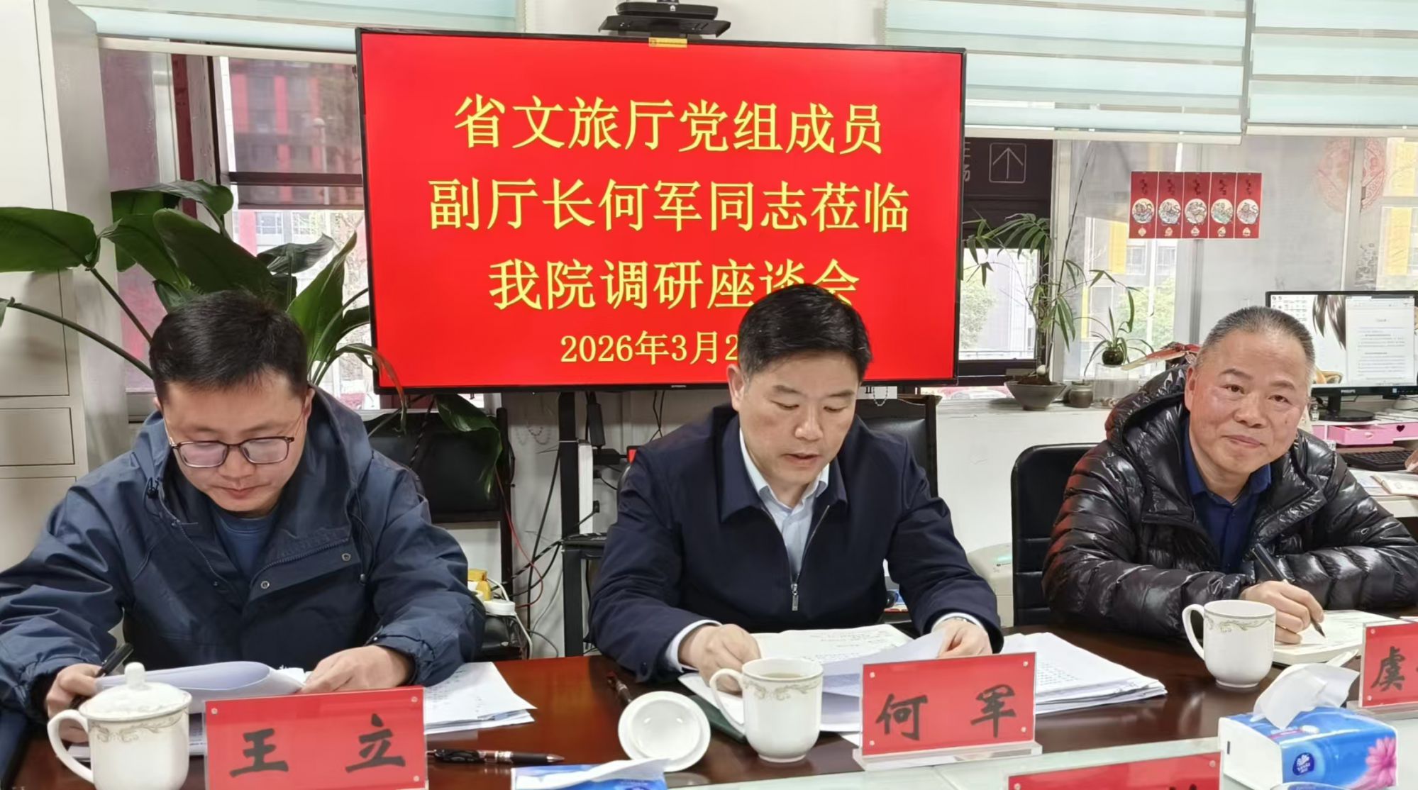 为深入贯彻习近平新时代中国特色社会主义思想、习近平文化思想,认真落实中宣部等五部门联合印发《戏剧振兴三年行动计划(2026—2028)》部署要求,推动国家级非物质文化遗产-黔剧高质量发展,2026年3月26日下午,省文旅厅党组成员、副厅长何军同志莅临我院调研指导工作,省文旅厅艺术处负责人、一级调研员虞奇勇、艺术处四级调研员王立陪同调研。