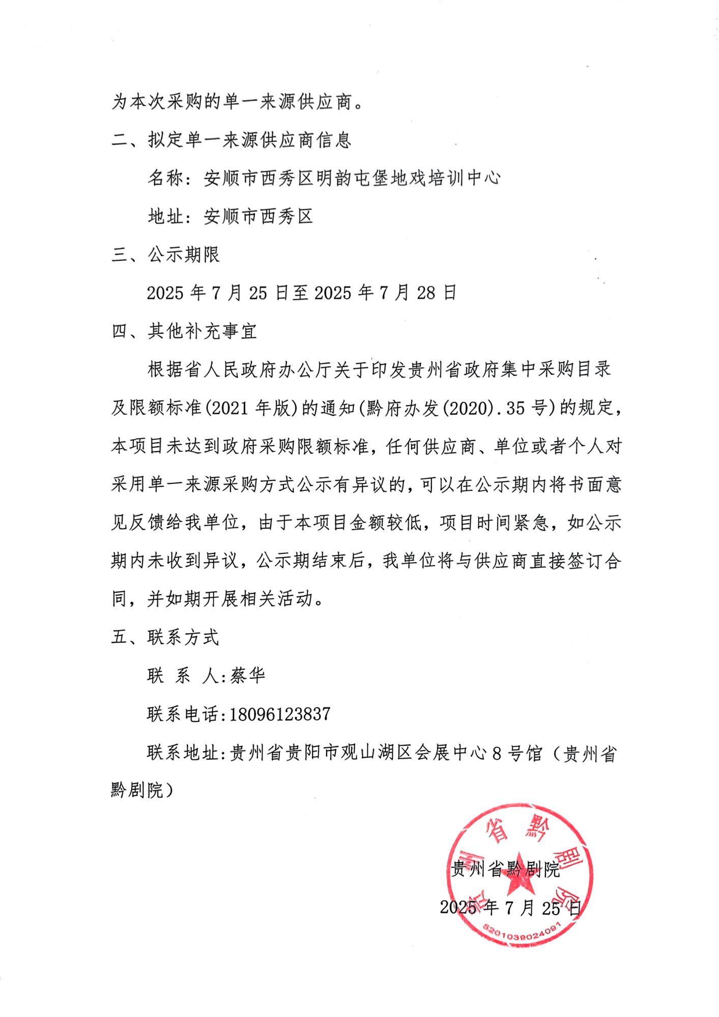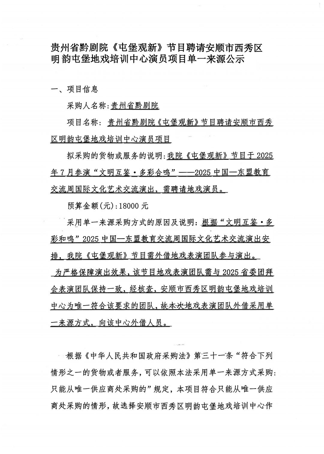 贵州省黔剧院《屯堡观新》节目聘请安顺市西秀区 明韵屯堡地戏培训中心演员项目单一来源公示