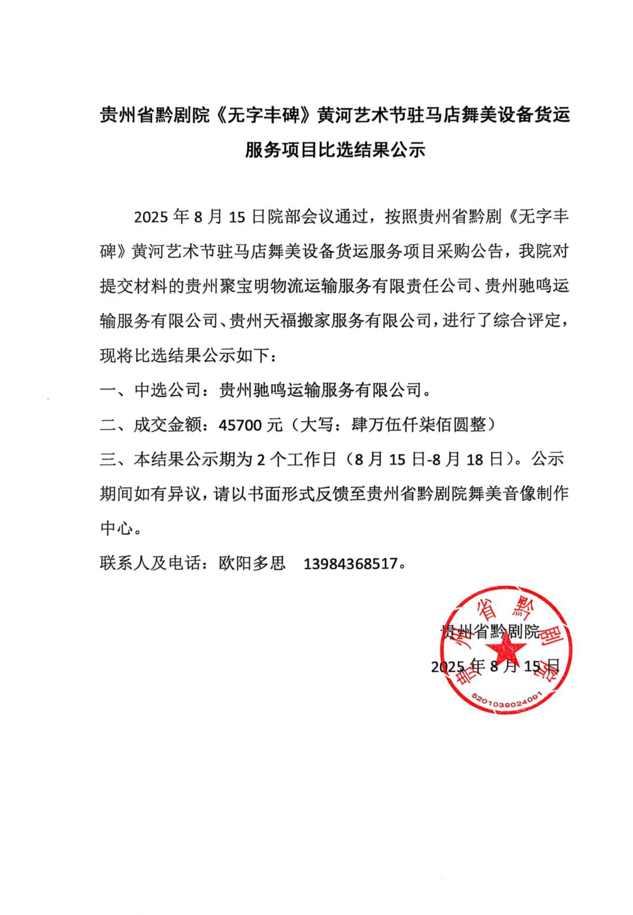 贵州省黔剧院《无字丰碑》黄河艺术节驻马店舞美设备货运服务项目比选结果公示