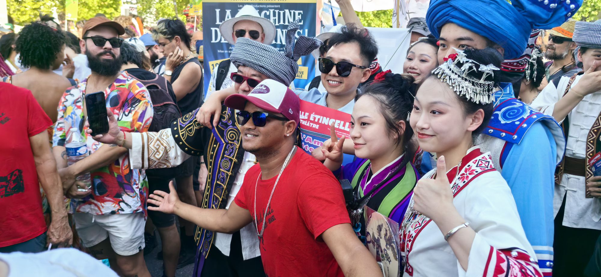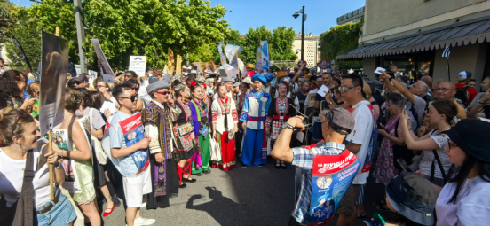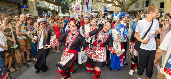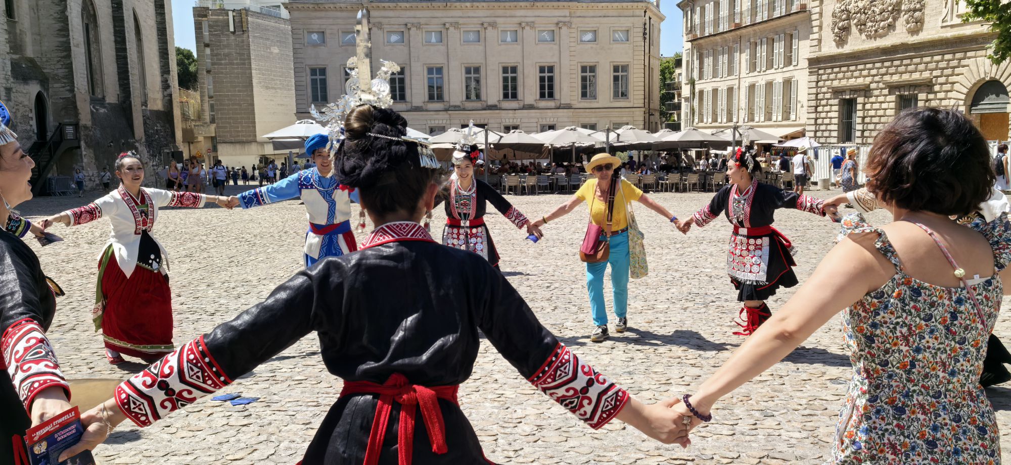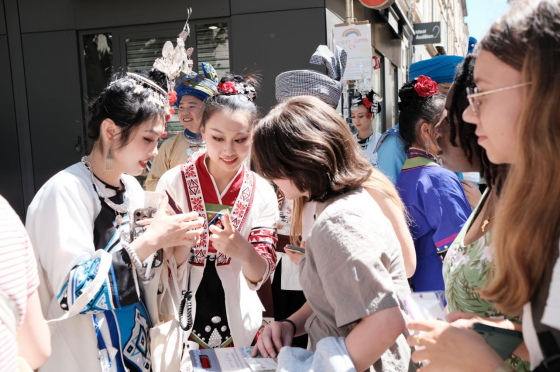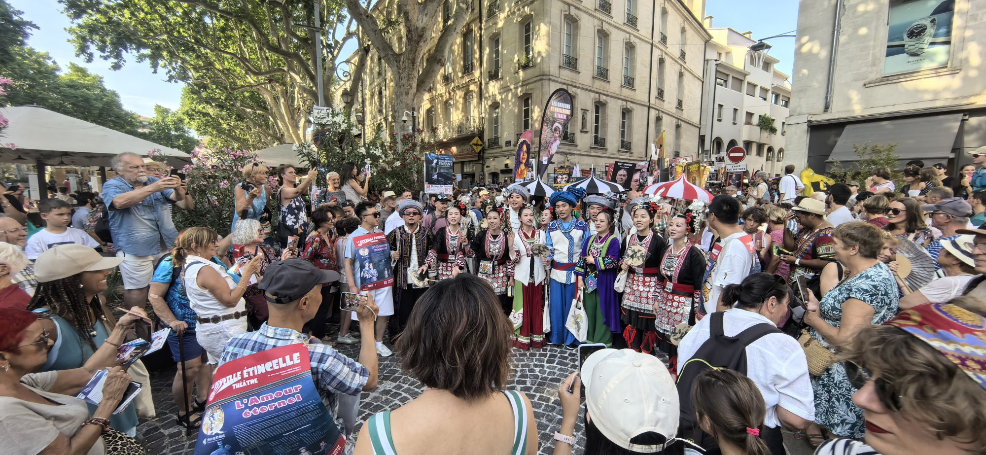 “Qin Niangmei, a love story from Guizhou, China!”完成剧场演出后,黔剧演员们又来到阿维尼翁的街头挂剧目海报、赠送《秦娘美》文创纪念品,并进行5次具有贵州民族、戏曲元素的快闪表演,将贵州戏曲文化元素,撒向这座中世纪古城的每一个角落。落。