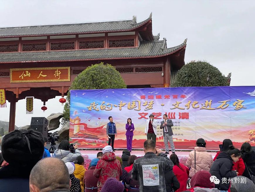 “不忘初心,继续前进,万水千山美丽中国道路……”嘹亮动听的歌声荡漾在仙人街景区上空,赢得台下观众阵阵掌声。2021年3月21至2021年7月9日,贵州省黔剧院“我们的中国梦文化进万家”文艺巡演正式拉开帷幕。先后为石阡县、三都县、赤水市、贵阳市观山湖区、仁怀市、六枝特区及修文县送去百场精彩演出。此次百场巡演节目丰富多彩,每一个节目都是院团反复挑选,精心编排而成,有中宣部要求完成的歌曲:《起大樑》,《春风十万里》,有专门为建党百年创作的相声《咱爷爷》,小品《世代不忘颂党恩》以及《川剧变脸》、魔术《梦幻世界》、快板《讲文明树新风》、杂技《力量》、合唱《不忘初心》等等,演出弘扬主旋律、传播正能量,内容丰富、形式多样,看到那些平时只能在电视电影中看到的艺术家来到自己身边,群众的内心被暖流紧紧包裹。六枝特区一位有50多年党龄的老党员,看完我们的文艺演出,连连感慨:“生活越来越美好,我们老百姓很幸福很满足。”