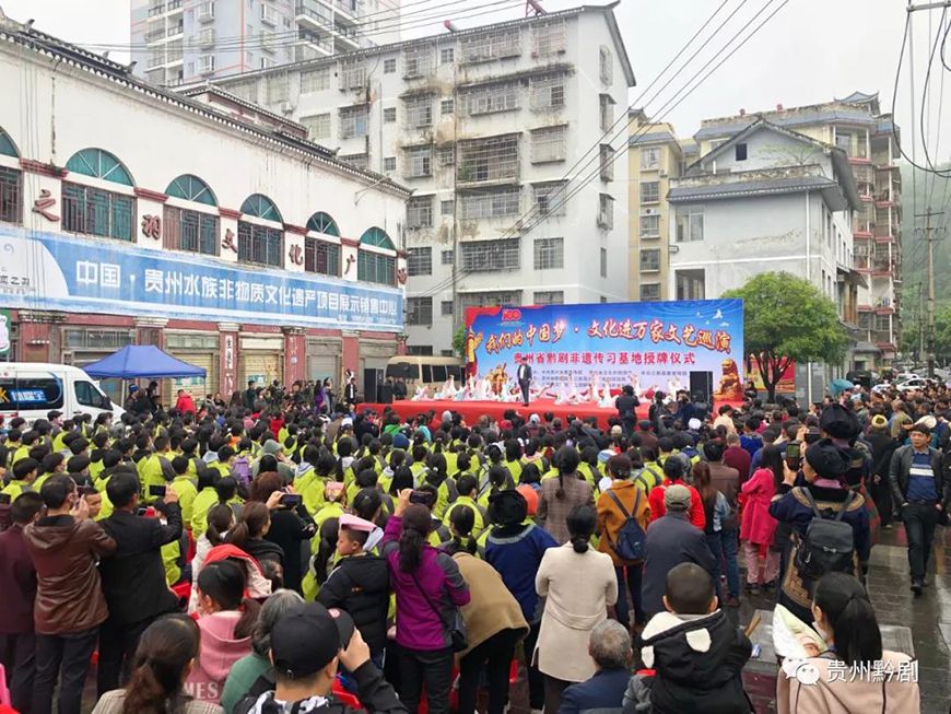 “能和贵州省黔剧院的艺术家一起同台演出,真的太高兴了!”三都县文化馆艺术团的演员们在给歌曲《幸福中国一起走》伴舞后仍心情澎湃,在三都的首场演出中,贵州省黔剧院院长朱宏,副院长陈林,党支部书记张亚西带领黔剧院优秀青年演员一行40人与当地文旅局共同举行了“贵州省黔剧非遗传习基地”,意在通过建立非遗文化戏曲传承基地广泛的文化活动,深入基层的教学实践与非遗的传承保护结合起来,为当地百姓建立更加广阔的学习研究展演等多层面的活动和交流平台。
