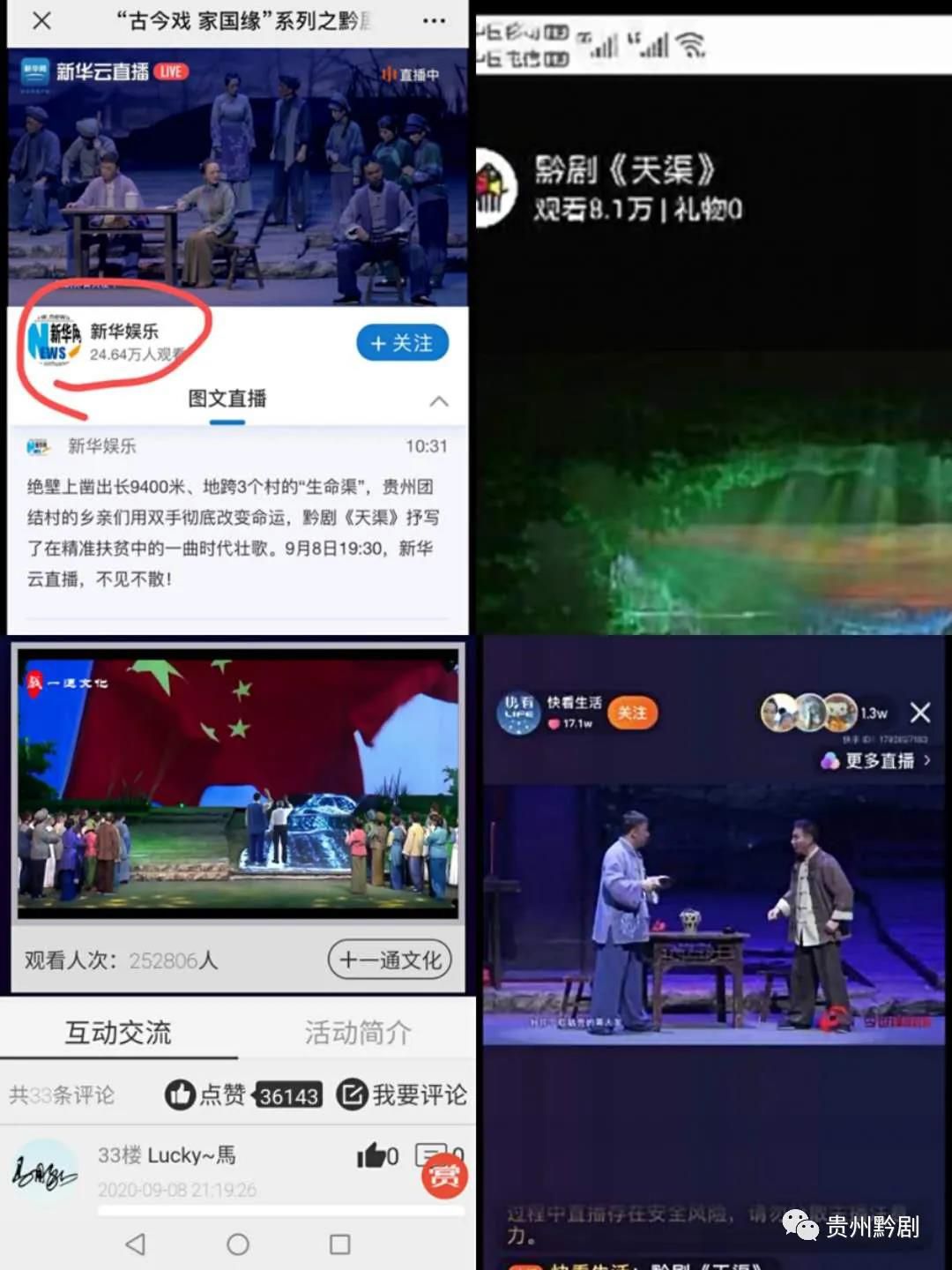 2020年9月8日晚19:30,大型脱贫攻坚题材、现实题材黔剧《天渠》准时在由中宣部、文旅部主办的2020年全国基层戏曲院团网络会演平台展播。两个小时的在线展演,黔剧《天渠》获评无数,获赞无数,在线观众人数成几何数增长,观看人次不断刷新,从突破十万再到突破百万,演出结束经文旅部艺术司统计,观看总量达到471.5万观看人次。真是震撼!这是继2019上海十二艺节《天渠》网络直播后,再一次代表贵州省参加全国性演出而取得的又一优异成绩,展演得到全国几百万观众的认可,刷新了历史纪录,取得了质的飞跃。