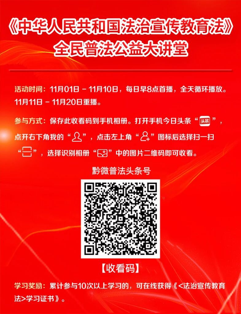 各级普法部门可通过学习通知广泛发布。为方便广大干部群众收看,鼓励在各类微信群里转发“收看码”,参与者保存“收看码”至手机“相册”。每天识别手机相册中的“收看码”即可观看学习(请勿使用微信扫一扫),也可以在今日头条搜索“黔微普法”进行视频查看。
