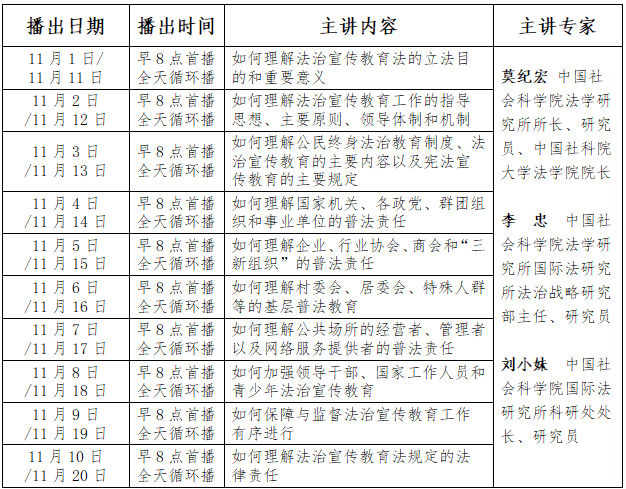 邀请中国社会科学院法学所所长、研究员莫纪宏,法学所国际法所法治战略研究部主任李忠,国际法所科研处处长刘小妹,精心录制了10讲《<中华人民共和国法治宣传教育法>理解与适用》(短视频),深入剖析立法亮点和法条精髓。